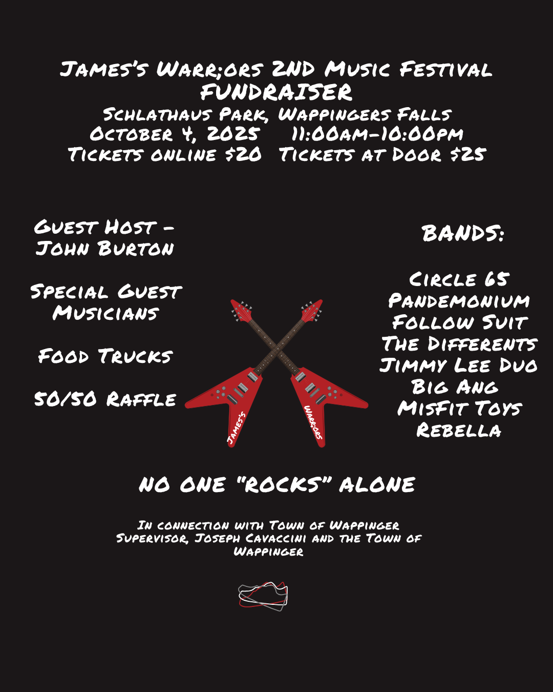 Save the Date!! James’s Warr;ors Music Fest, No One Rocks Alone! July 27, 2024 12pm - 9:30 pm at Schlathaus Park, Wappingers Falls, New York. Six Bands : Circle 65, Pandemonium, Follow Suit, The Differents, Jimmy Lee Duo and Big Ang Acoustic. Food trucks, Raffles. In connection with Town of Wappinger Supervisor, Joseph Cavaccini and the Town of Wappinger. Tickets are on Sale now. $20.00 purchased online, 25.00 at door, children under 5 free.